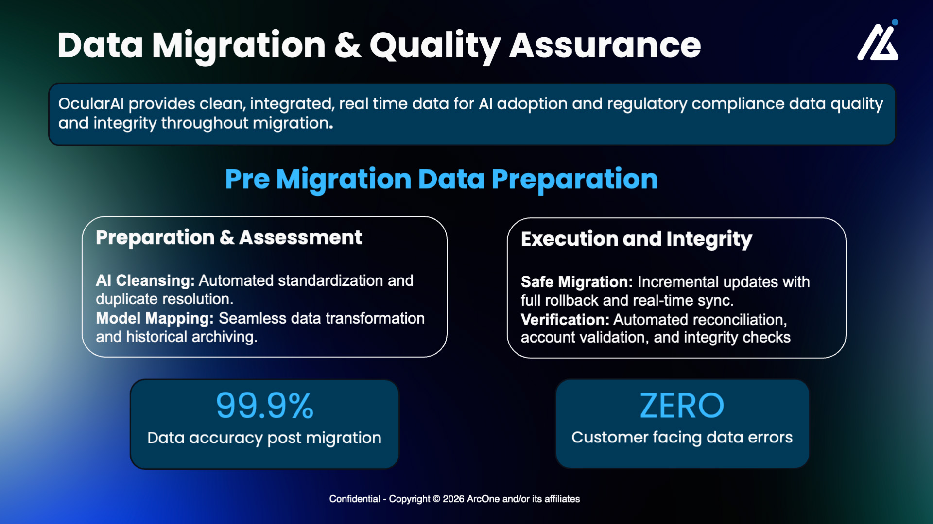 This image below highlights ArcOne’s OcularAI approach to data migration and quality assurance, emphasizing that clean, real-time data is critical for AI adoption and regulatory compliance.
